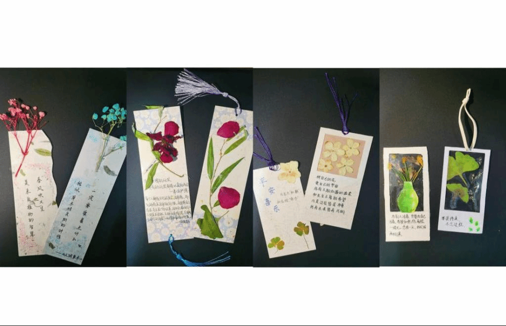 同学们通过选取植物标本、手工压制、自由涂鸦等创作程序,融合自己的奇思妙想,将抽象的情感思绪转化为具象的书签实物,绘制出一件件外观新颖、版面精美的书签,并在书签上写下了自我激励、美好祝福等温馨寄语,抒发内心的真情实感。
