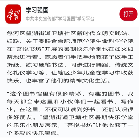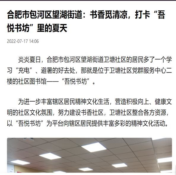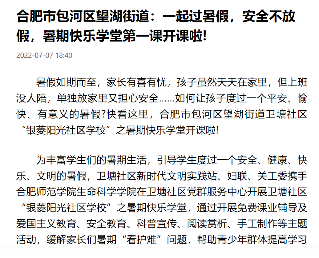 《学习强国》、《人民网》、《中国青年网》等国家级媒体相继报道学堂的开设情况,《安徽日报》、《掌中安徽》、《合肥晚报》等媒体报道了学堂日常生活情况。“喜迎二十大”爱国教育和暑期防溺水主题教育经合肥电视台进行采访,并于《晚间播报》、《早安合肥》等新闻频道、腾讯视频平台进行播放。此外,微信公众平台《美望湖》、《合师生科》也对学堂进行了宣传报道,该学堂共被各家媒体报道14次。