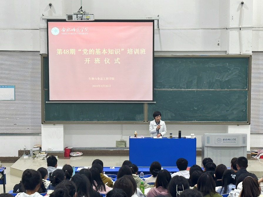 本网讯 为深入贯彻党的二十大精神,切实加强对入党积极分子和发展对象的培养、教育和考察,提高思想政治素质。4月26日中午,beat365正版唯一官网在逸夫楼西阶2教室举行第48期“党的基本知识”培训班开班仪式。beat365正版唯一官网党委书记郭桃芬出席仪式,142名入党积极分子和20名发展对象参加了开班仪式,仪式由党课培训班主任梁悦主持。