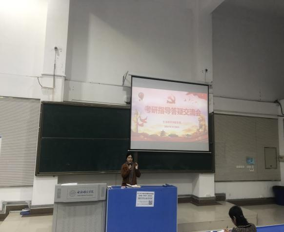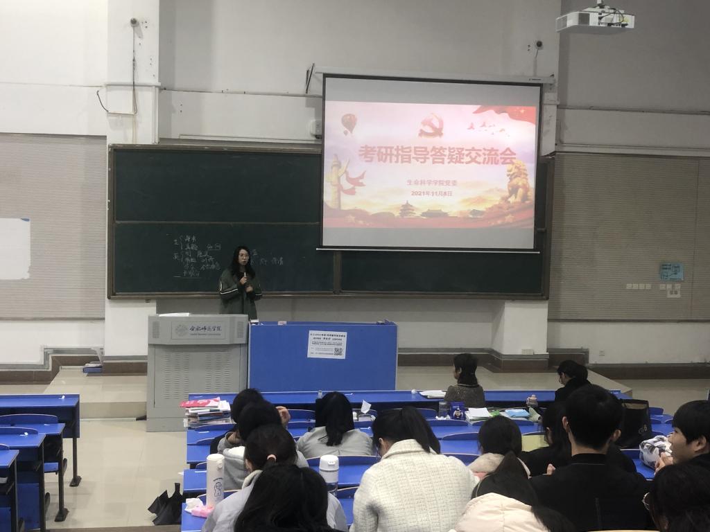 本网讯 为帮助毕业班考研学生解决实际问题,指导他们高效备战,缓解考前压力,提高成功率,进一步推动“为群众办实事”实践活动走深走实。11月8日中午,生命科学学院在逸夫楼西阶一教室开展毕业班考研指导答疑交流会。出席会议的有生命科学学院党委书记郭桃芬、副书记杨娜。指导答疑由教工党支部书记王占军、陈金武、方雪以及党员教师程诚、杨星星五位老师主讲。交流会由2018级辅导员杨帆主持,2018级一百余名学生参加。